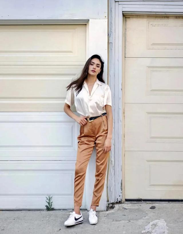 白色的丝绸短袖衬衫搭配橘黄色的丝绸高腰烟管裤,把衬衫塞进裤子内打造出高腰线,显高又显瘦。丝绸面料非常有高级感,温柔精致又气质。白色与橘黄色的搭配显白又活力,时尚大方又气质十足。