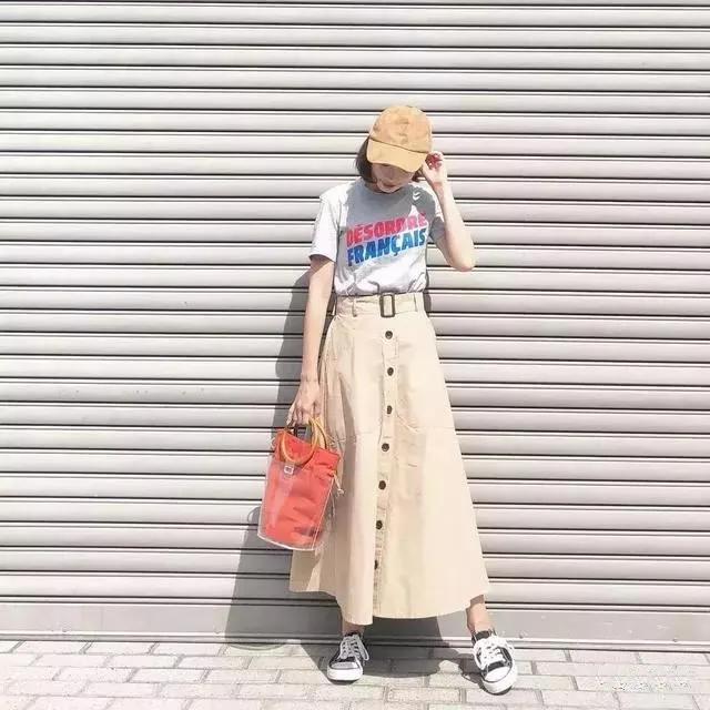 浅色的修身T恤搭配卡其色的高腰半身裙,显高又显瘦。同样浅色系的搭配干净清新,舒服又有高级感。T恤上的字母撞色图案为穿搭增添了时尚感,更有活力。整套穿搭简约休闲,优雅又气质。