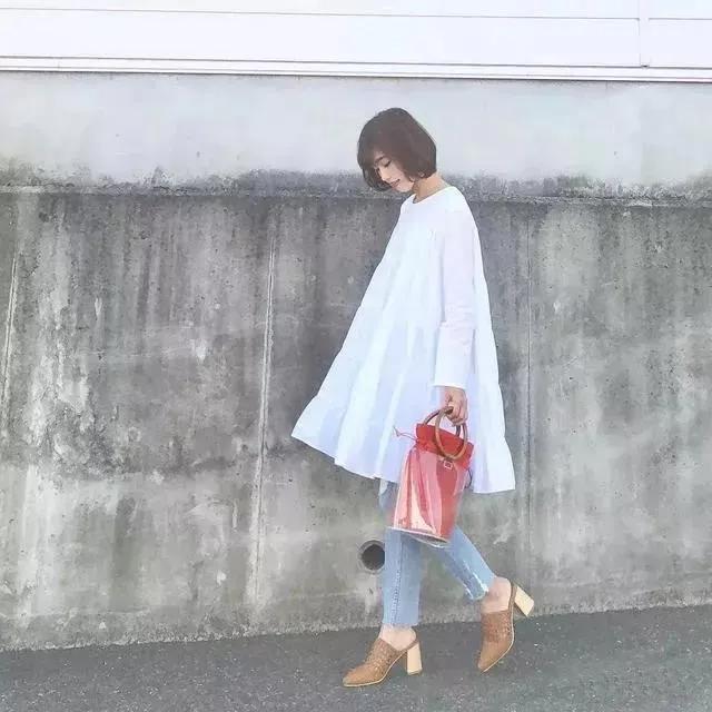 白色的中长款连衣裙干净气质又有几分可爱的味道,内搭浅色的修身牛仔裤,增添了时尚感,更显优雅。整套搭配减龄简约又耐看,时尚大方又气质。