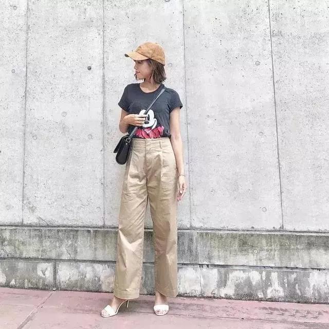 黑色的米奇图案T恤搭配卡其色的高腰阔腿裤,把T恤塞进裤子内,打造出高腰线,显高又显瘦。图案T恤可爱趣味又减龄,让小个子妈妈重回青春。整套搭配简约气质,时尚十足。