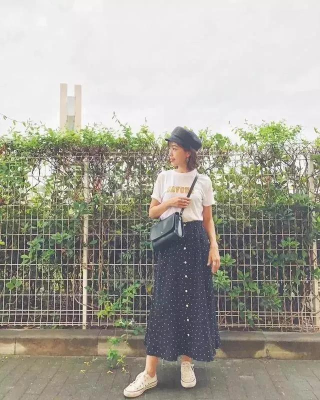 白色的字母印花T恤搭配黑色的高腰波点半身裙,打造出高腰线,显高又显瘦。裙子的波点元素增添了可爱和甜美,让小个子妈妈也可以很减龄。整套穿搭简约时尚,青春又气质。