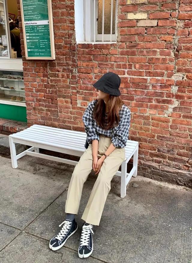 黑白格纹的衬衫搭配卡其色的高腰烟管裤,显高又显瘦,小个子妈妈也可以变身文艺少女,非常减龄。一顶黑色的渔夫帽增添了时尚感又有视觉显高的效果,特别适合小个子妈妈。