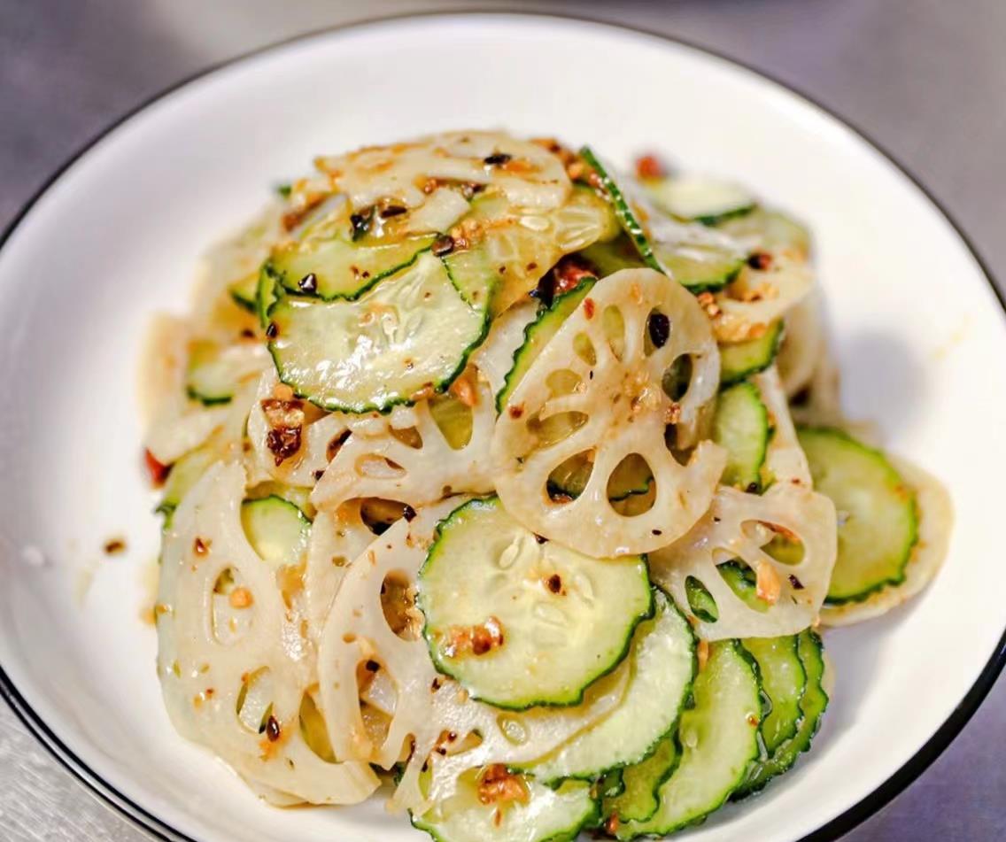 配料:莲藕300克,黄瓜100克,醋,蒜末,酱油,盐,辣椒油,花椒油,香油,白糖