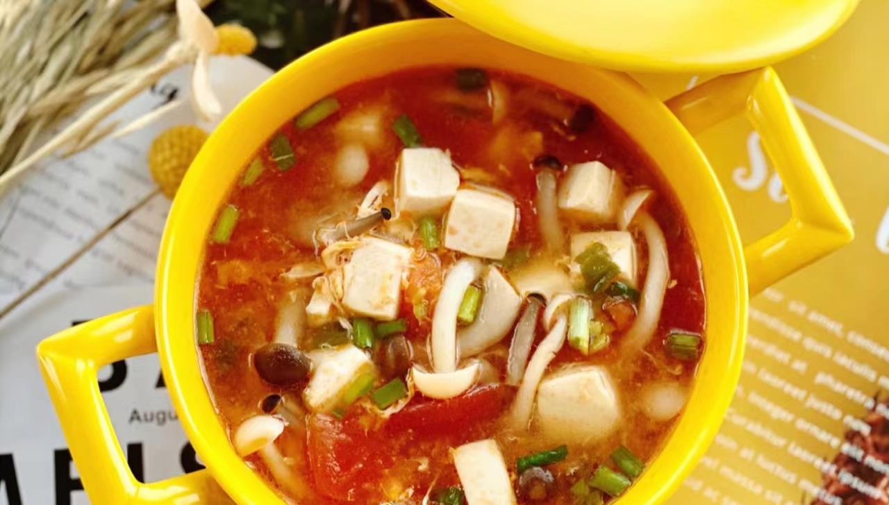 白嫩的豆腐配上红色的西红柿、黄色的鸡蛋和一些蘑菇,以增加新鲜度。豆腐和蘑菇碰撞,鲜美的汤汁浓稠,开胃爽口,低脂低热量,营养丰富。“