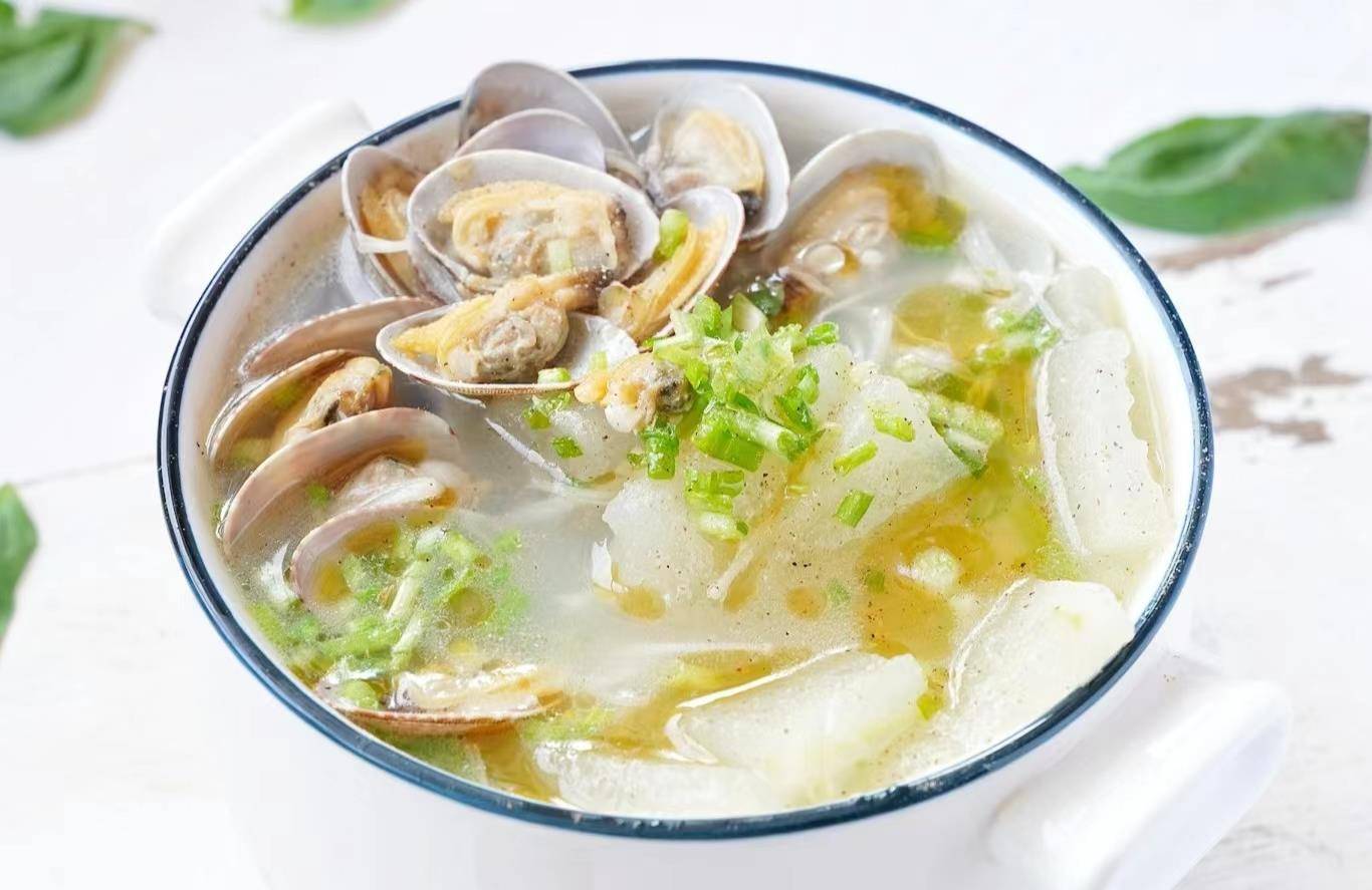 原料:文蛤、冬瓜、金针菇。料酒、盐、白胡椒粉。