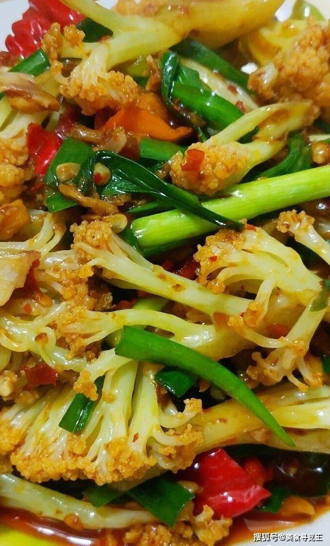 3、倒入花菜,大火快速翻炒,因为花菜焯过水,易熟,炒30秒左右,关火前倒入蒜苗叶;翻拌均匀就可以直接出锅了! 花菜有的喜欢吃比较软烂的,可以提前焯水;同时在洗花菜的时候,可以提前用盐水浸泡一会,这样才能更好地把花菜里面的杂质完全冲洗干净;
