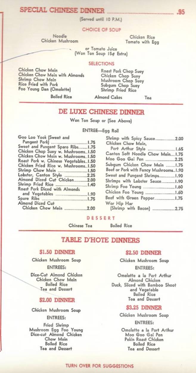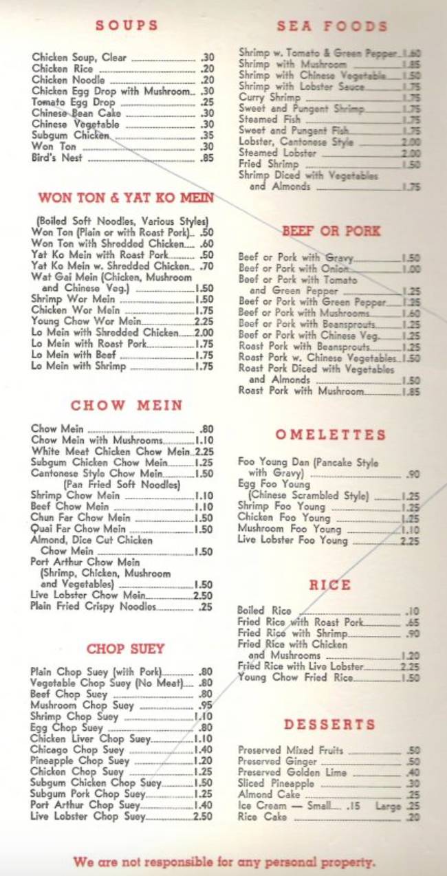 在华埠勿街45号经营四十年之久的Rathskeller中餐馆,于1936年12月21日开张,至1976年结束营业。图中可辨“杂碎”(Chop Suey)招牌。(中华公所历史图片)
