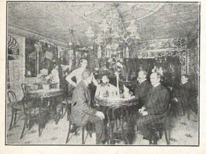 纽约华埠宰也街旧时中餐馆探花楼内部情形,照片拍摄时间不详,但从图中的红旗可看出应该还是满清时代。(中华公所历史图片)
