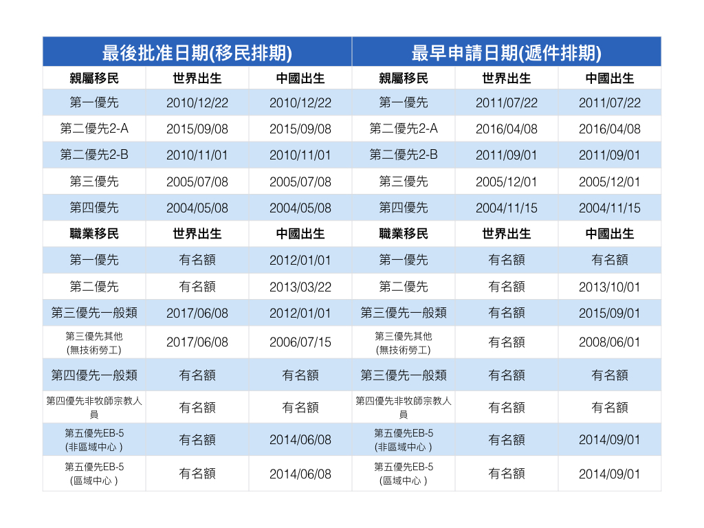 职业移民类:中国出生第一优先原地踏步;中国出生第二优先(具高等学位或特殊能力者)推进三周;中国出生第三优先(一般类)倒退两年十个月;中国出生第三优先(无技术劳工)原地踏步;中国出生之外的第三优先推进近两个月;中国出生的第五优先EB-5(区域或非区域中心)原地踏步。