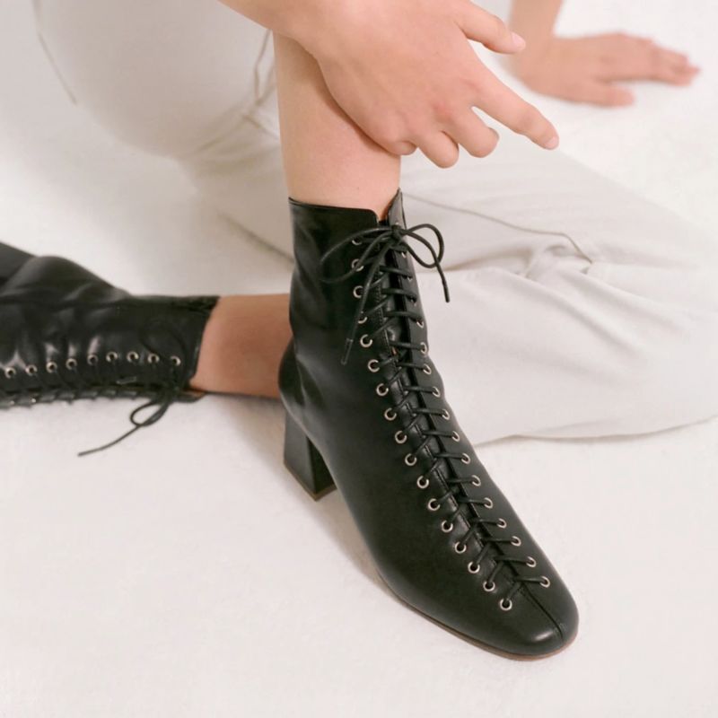 系带的靴子,常见的便是马丁靴这一挂。除外之外,其它样式也非常受欢迎,比如高跟方头系带短靴,也很气质。