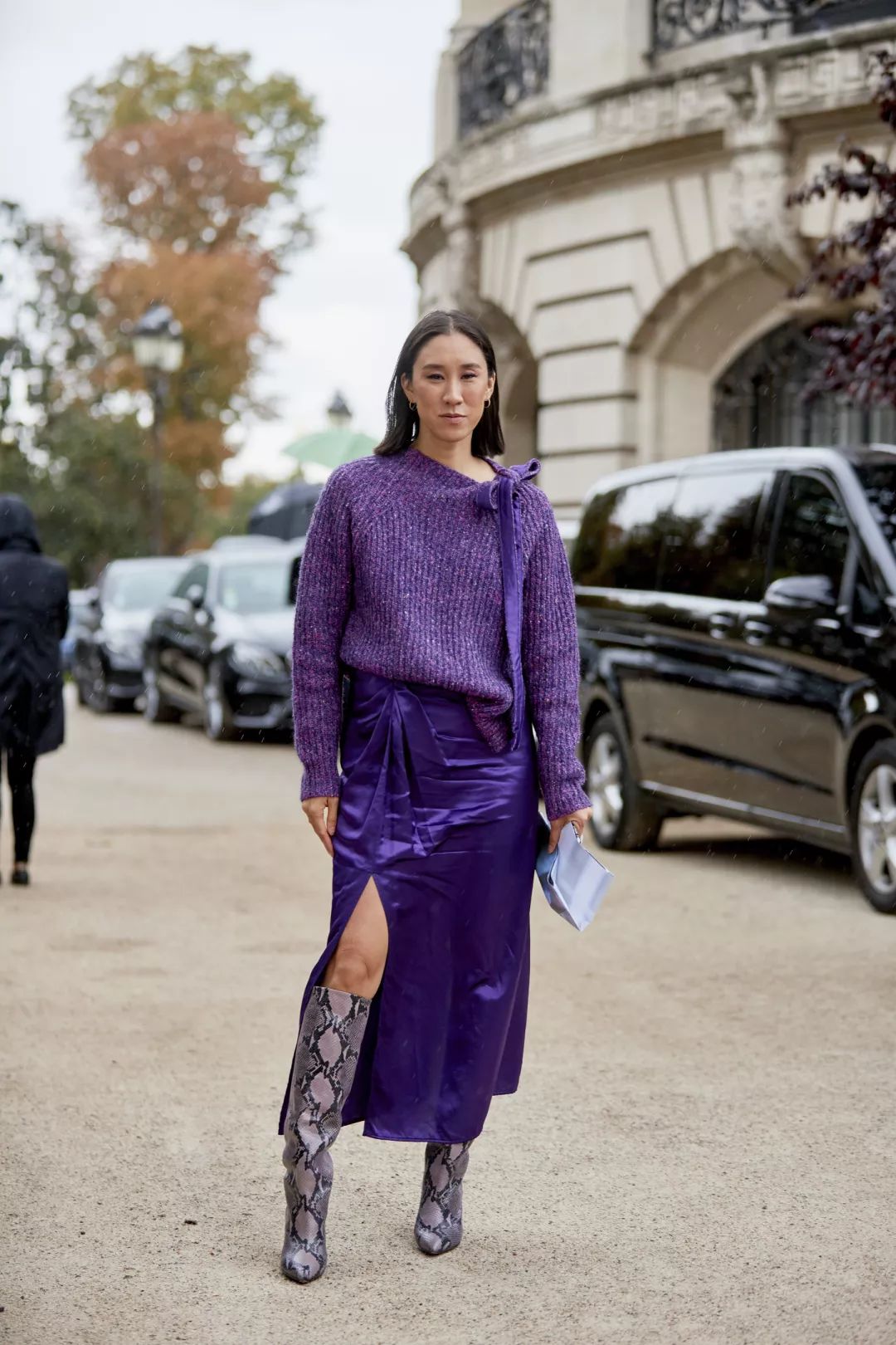 紫色蛇纹足够绚丽,玩一玩单色穿搭,搭配同色系半裙和大毛衣。