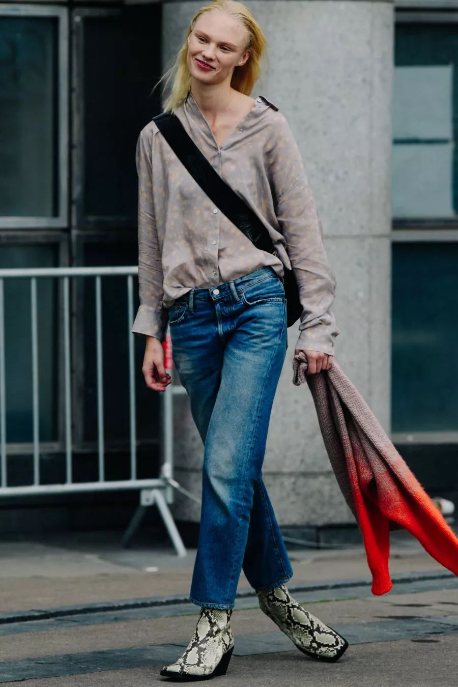 也可以耍点小花样,将牛仔裤的一半裤腿塞进短靴,依旧是走路带风。