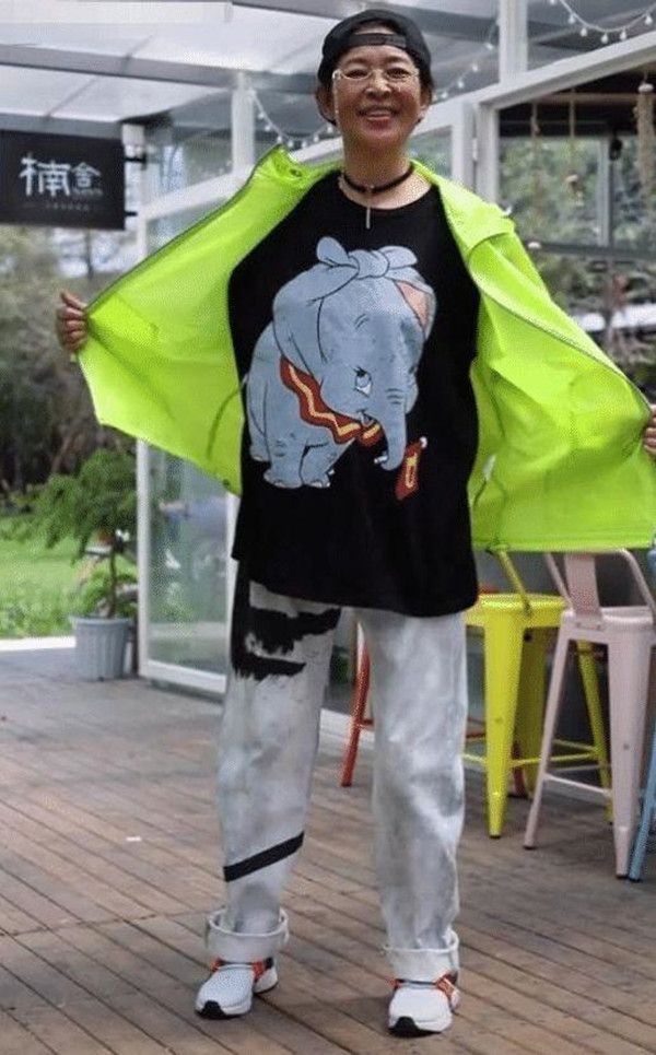 这一身黑色T恤搭配一件牛仔裤,外搭一件荧光黄的外套,脚上一双运动鞋,整体给人的感觉就超级活力,超显年轻,牛仔裤的水洗泼墨设计也是很有新意,在她这个年纪上绝对是装嫩的好搭配,看起来比平时年轻多了!