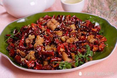 5、将油倒出留少许底油,下入葱姜蒜爆香,下花椒和干红辣椒煸炒出香味。