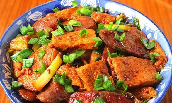 用料 主料千叶豆腐200克香肠120克青蒜50克 辅料油30毫升白糖5克豆豉辣酱1汤匙生姜3片蒜片3瓣生抽10毫升 做法 1.准备所有食材 2.把千页豆腐切片,青蒜洗净后把梗和叶分开切段 3.准备蒜片,生姜片和豆豉辣酱 4.热锅温油把豆腐逐片加入后用中火煎至两面金黄后捞起 5.香肠用温水洗净后隔水蒸15分钟后取出切片 6.留底油加入生姜片和蒜片爆香 7.先把蒜根加入煸炒出香味 8.再把香肠加入加入少许料酒 9.煎好的豆腐回锅加入一勺豆豉辣椒酱和10生抽毫升后煸炒均匀 10.加入少许开水后烧2分钟让豆腐入味后再把蒜叶加入,加入少许白糖提味后熄火出锅