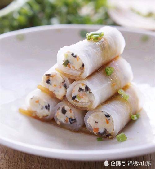 8、准备一张豆皮,铺在菜板上 然后再放入馅料,从一端给卷起来,边缘处涂抹蛋液,之后再给卷起来