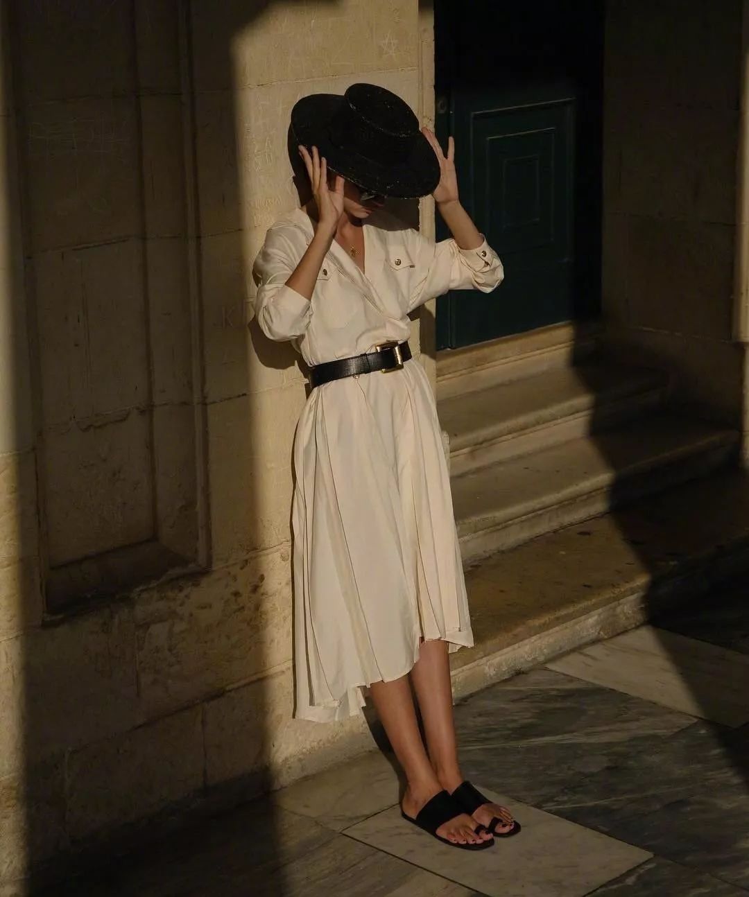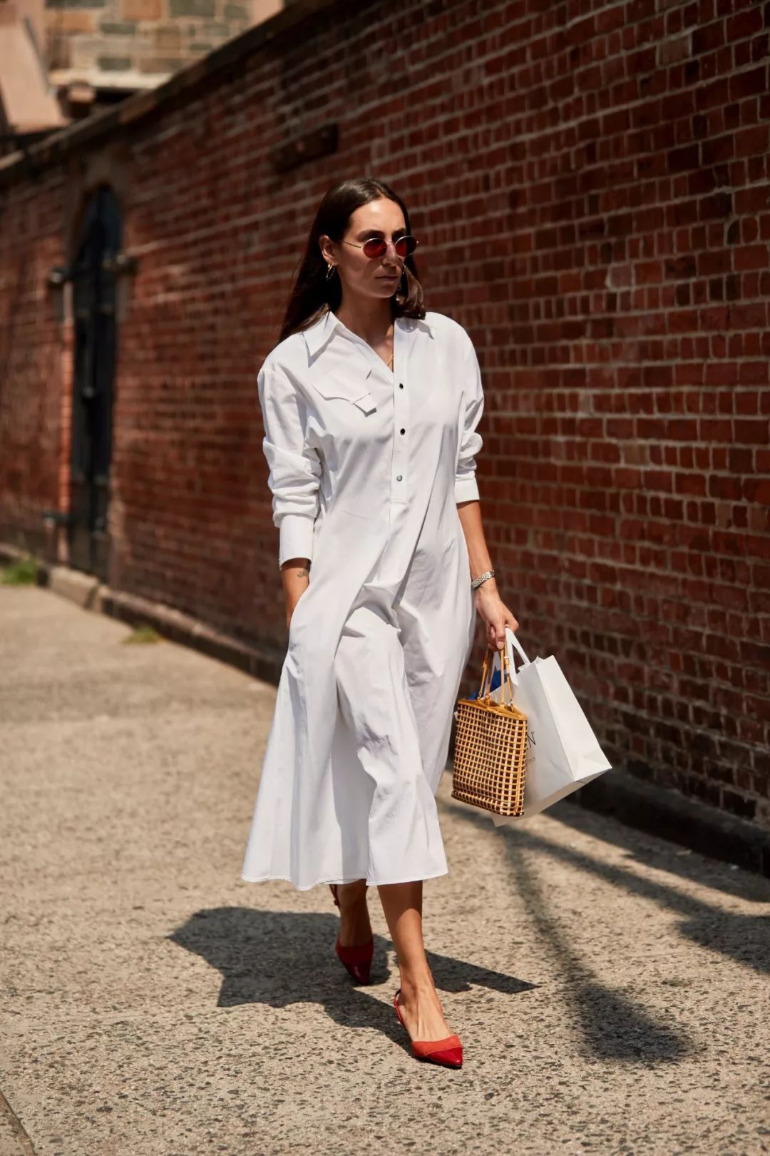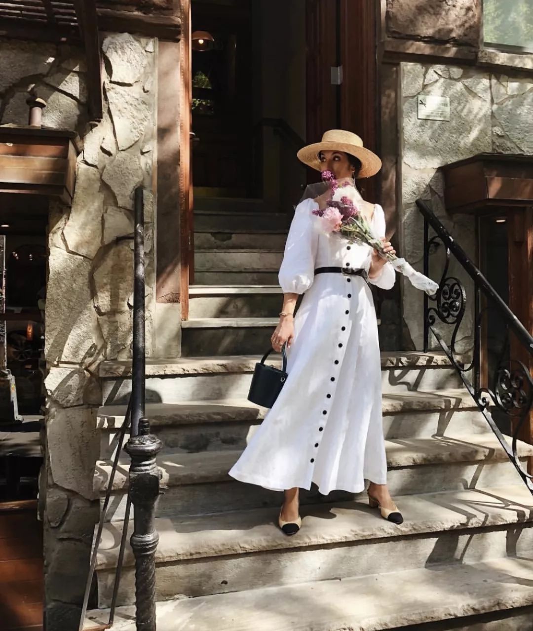 时髦精们尤其偏爱亚麻质地的白色纽扣裙款,复古高级又颇具慵懒感。