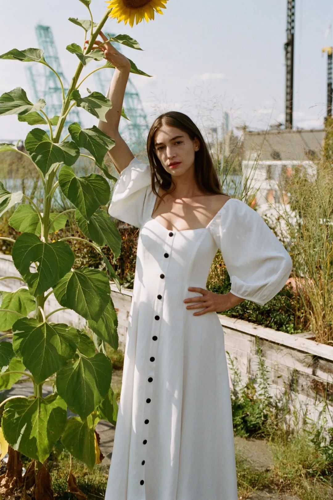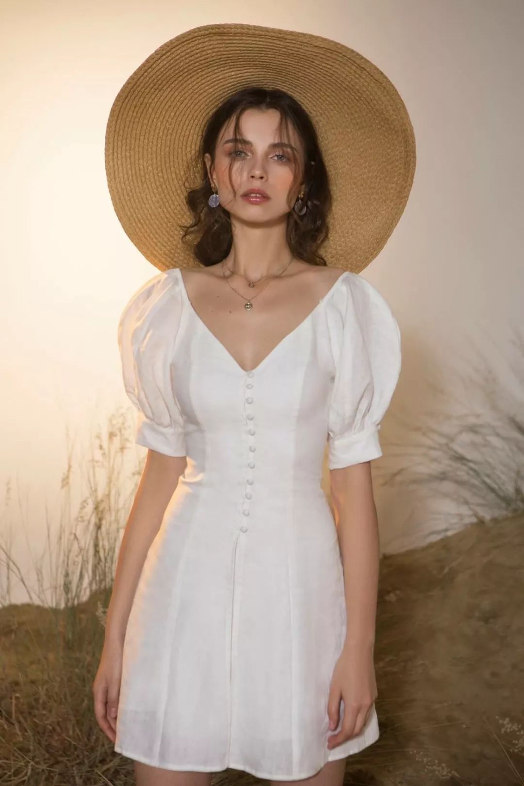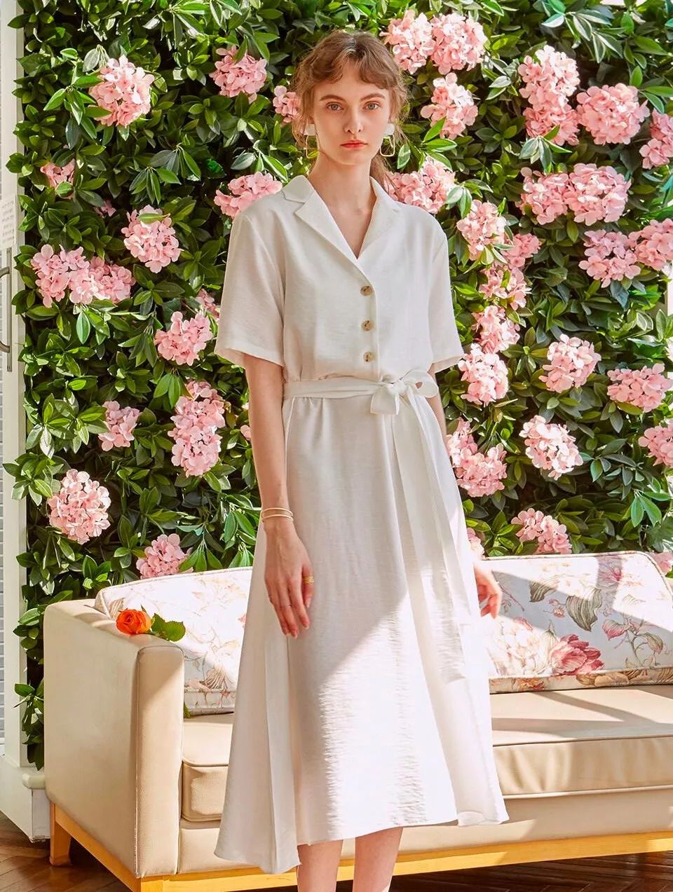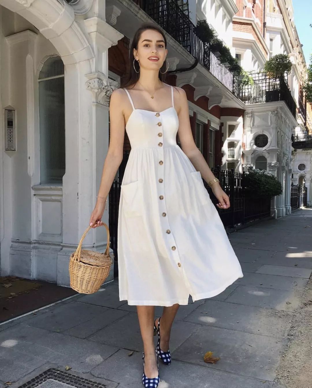 时髦精们尤其偏爱亚麻质地的白色纽扣裙款,复古高级又颇具慵懒感。