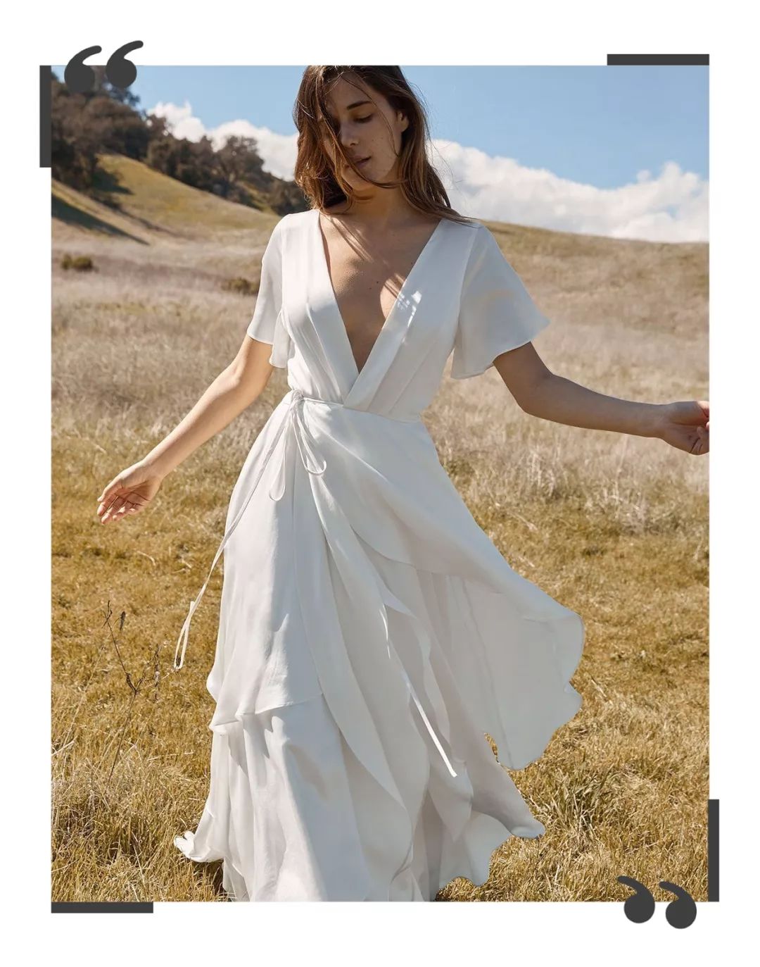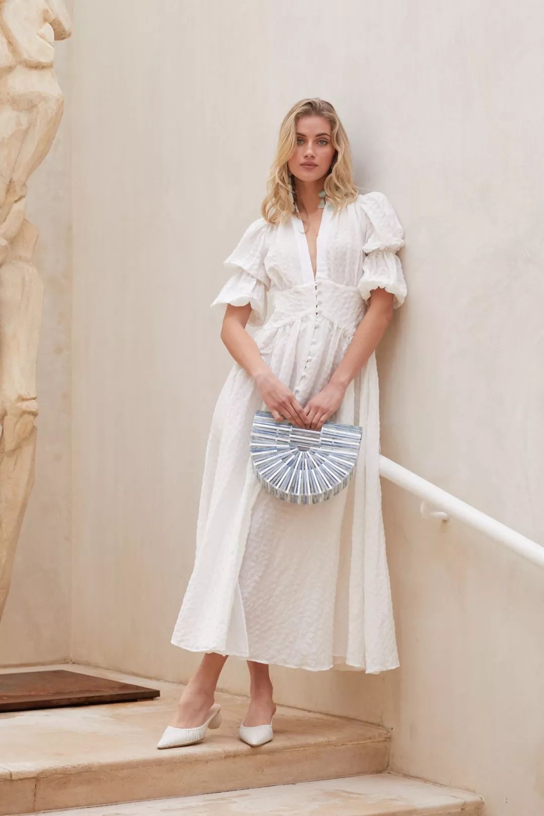 白色纽扣裙亦是时下备受ins博主们追捧的大热网红裙。别看纽扣元素小小的不起眼,对于极简小白裙而言却是当之无愧的生花妙笔。