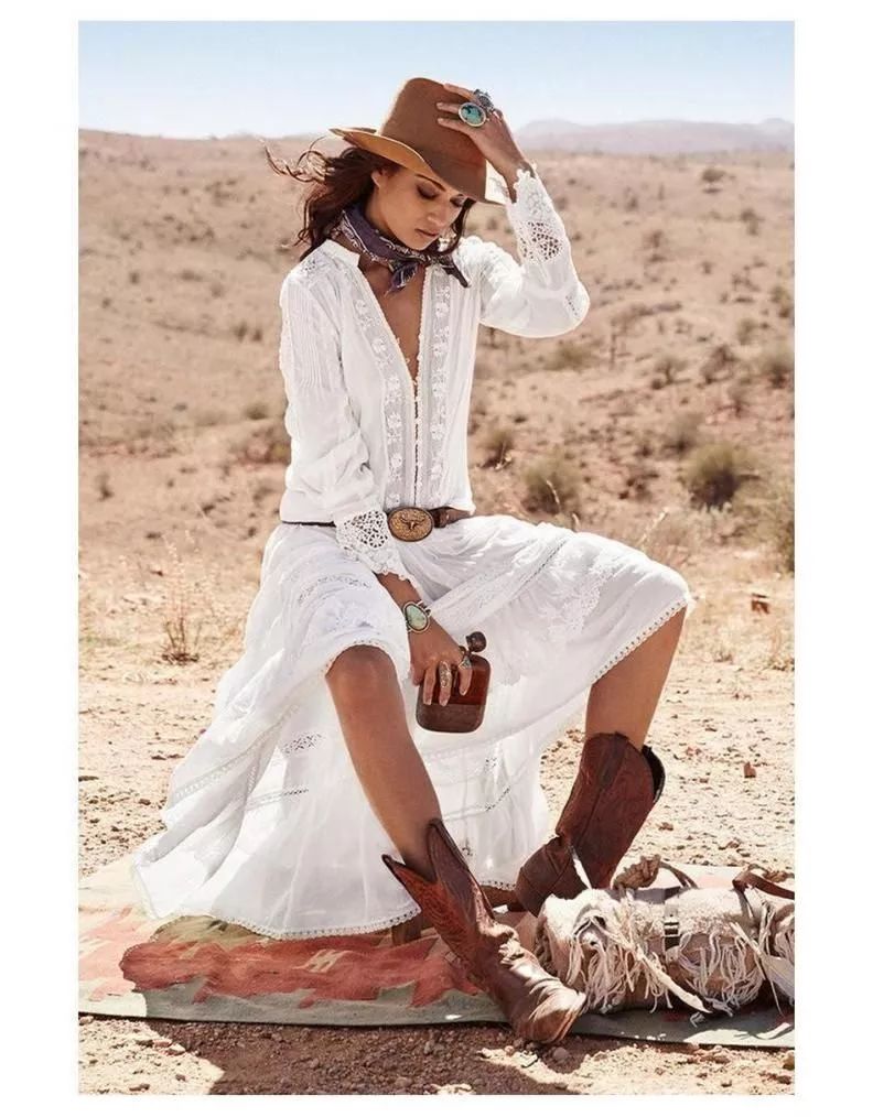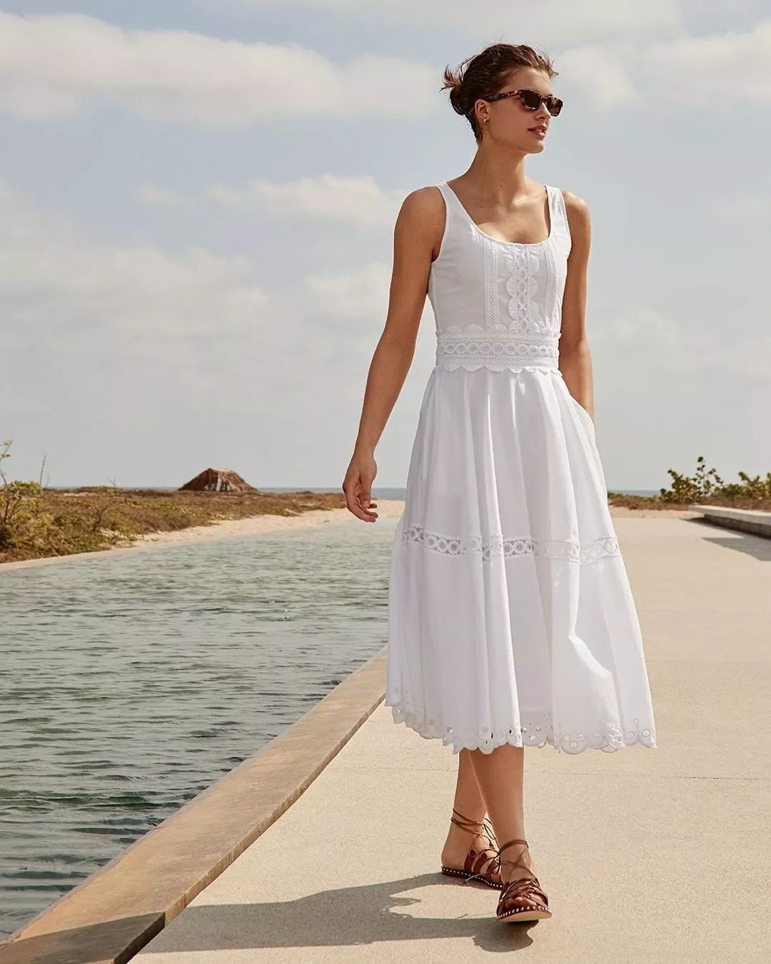 这种长款的蕾丝镂空小白裙很有波西米亚风情,超级适合去海边度假穿搭。