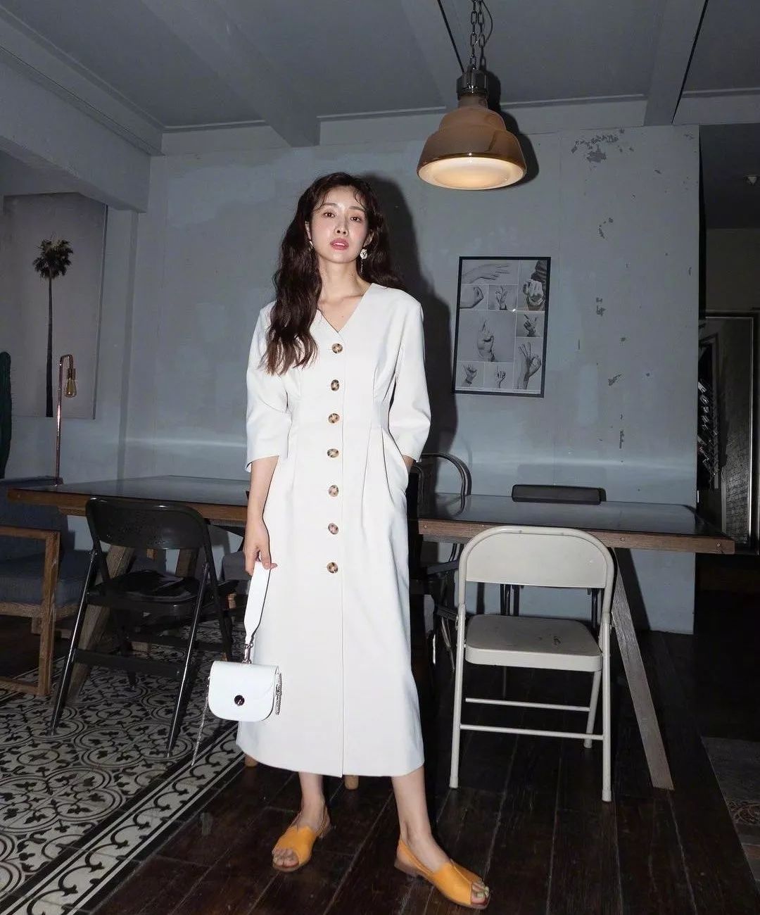 V领白色纽扣裙最具复古感,气质十足好看到犯规。