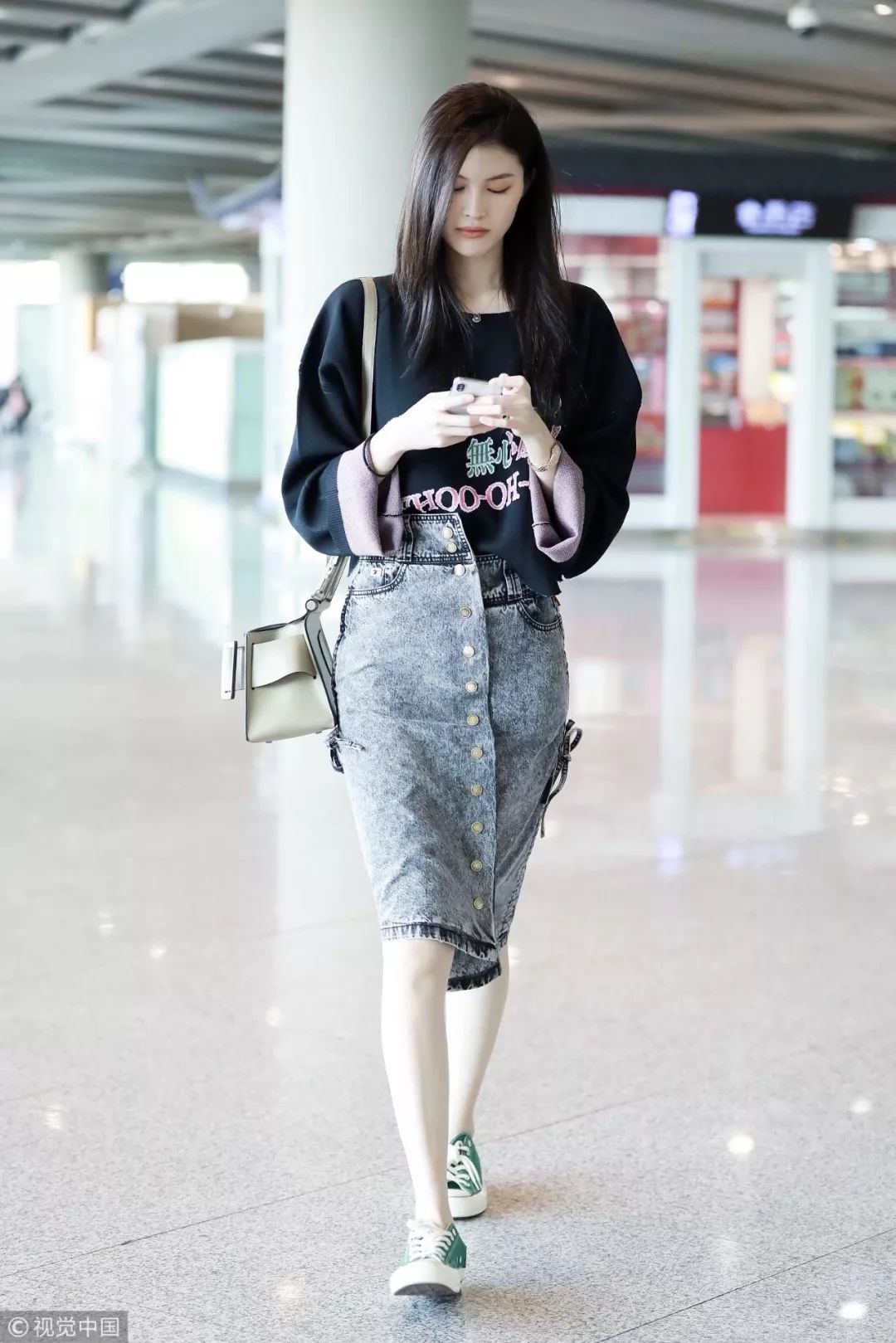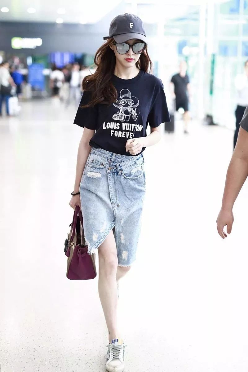 唐嫣在机场照中用牛仔裙搭配T恤,随性也好看。