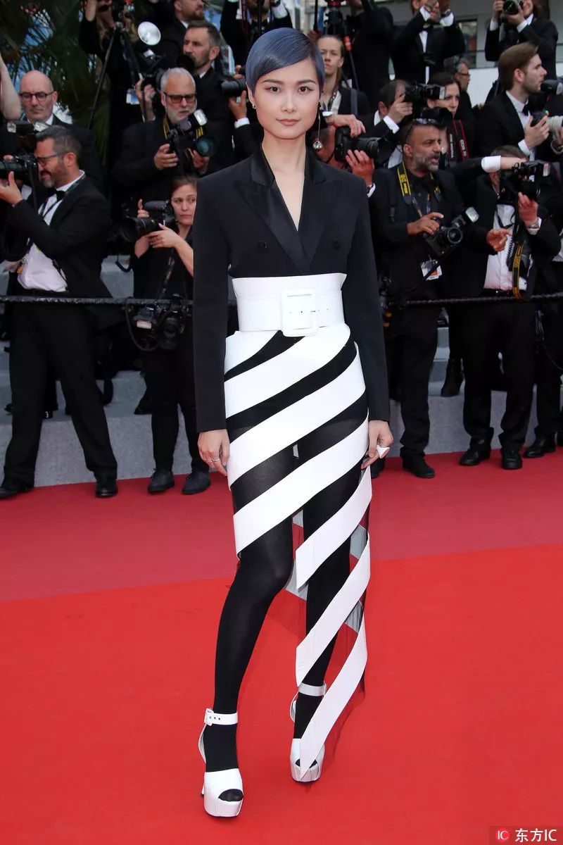 李宇春在戛纳电影节上就穿着了一个白色绕带的半身裙,配上白色腰带打造出高腰裙的效果,整个视觉上有一种胸以下全是腿的效果。