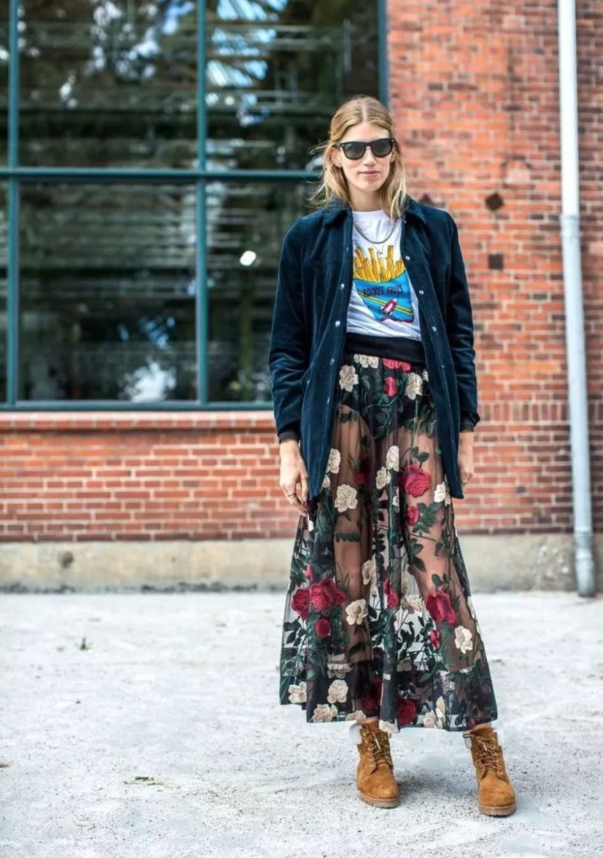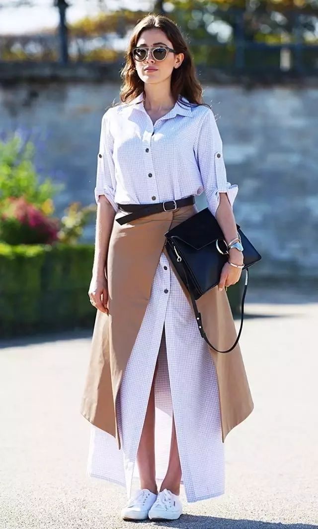 选择超级长的衬衫裙,把半裙随意的穿在高腰位置上,露出里面的衬衫裙和外面的半裙,时髦度非常的高!