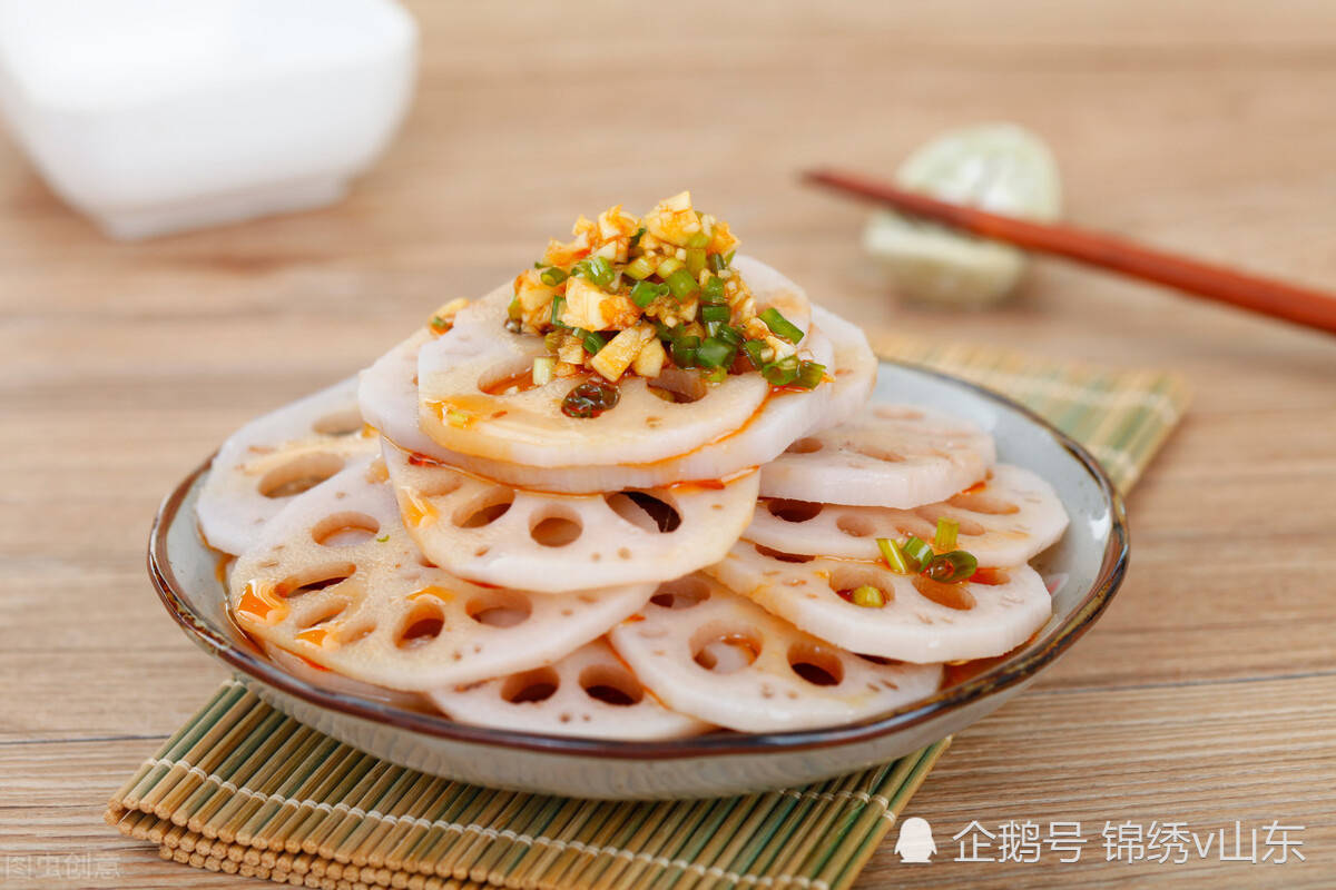 第七步:捞出的藕片要迅速过凉水,然后沥干水分备用。把藕片放入碗中,倒入刚才调好的料汁,再撒上少许花生碎,小红辣椒段、香葱末,香菜末即可上桌。