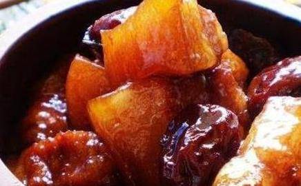 材料:猪脚 (160g)调料红枣 (100g)白莲子 (20g)五爪金龙 (10g)盐 (5g)冰糖 (5g)白糖 (20g)味极鲜 (5g)叉烧酱 (5g)生粉 (5g)