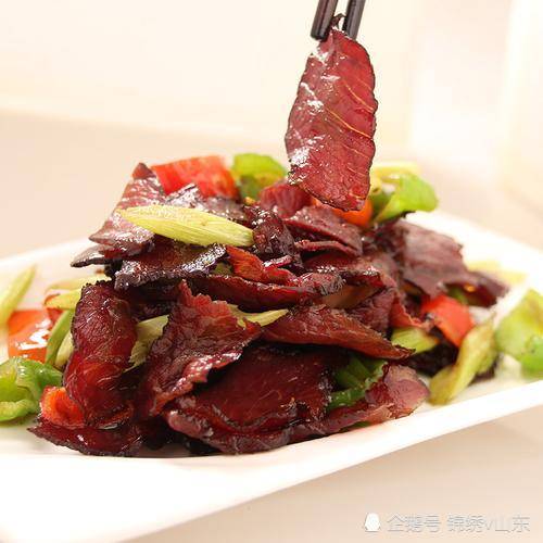 3、烘烤:出缸后,将腌牛肉条一端穿上麻绳,送入烘柜内烘烤17小时,即成长沙腊牛肉。