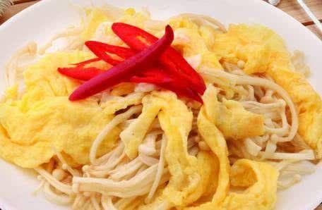 4、锅中放少许油烧热,下金针菇,炒至发软,加入炒熟的鸡蛋;
