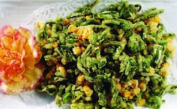 材料:黄瓜香400克,罐装玉米粒150克。调料精盐、味精、白糖、葱米各5克,椒盐3克,生粉100克,色拉油1500克,香油5克。