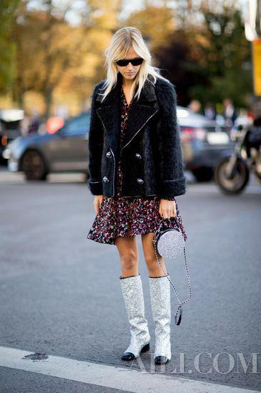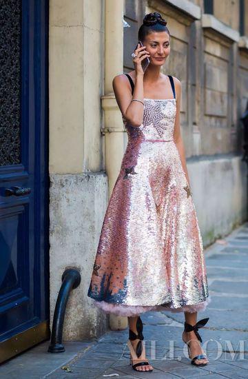 首当其冲的当然是能让人一眼看到的裙子,先抓住视线你就赢了一半,接下来就是美的问题了。要注意,抓住视线的意思可不是让你穿得像个移动的调色板,用简单但不单调的金属亮片元素就好。