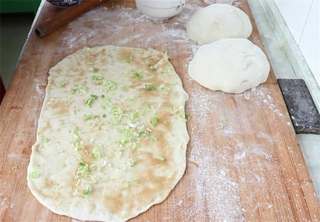 5.案板上撒些干面粉,把面团揉成长条状,再揪成3个同样大小的小面团,再分别把小面团整理下用擀面杖擀成薄厚均匀的面饼,上面刷上油酥,再均匀地撒上葱花。