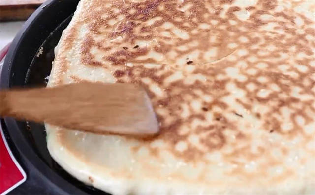 8.电饼铛上倒入适量的油用刷子刷匀,油热以后把擀好的饼胚放上面烙,每隔两分钟把饼翻过来烙,烙的时候也要盖上盖子,这样可以保证饼里面也能熟透,最后烙至两面金黄的时候就可以出锅了,我大概烙了7-8分钟。