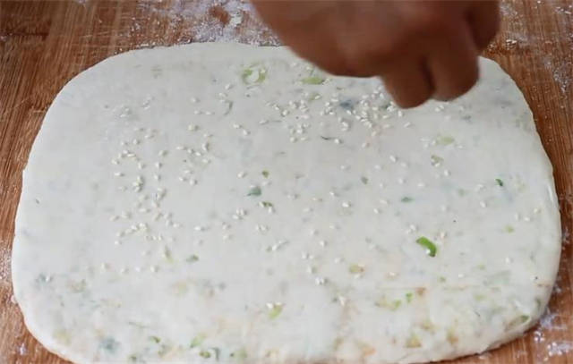 7.饧好后再用擀面杖擀成薄厚均匀的饼胚,上面刷点水撒上白芝麻,用手轻轻按压。