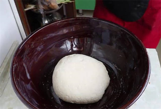 4.现在面团发酵好了,这个碗里有少量的热水,里面加入一小勺小苏打拌匀,和面团揉在一起,加入小苏打的作用是为了做出来的葱花饼更松软好吃。
