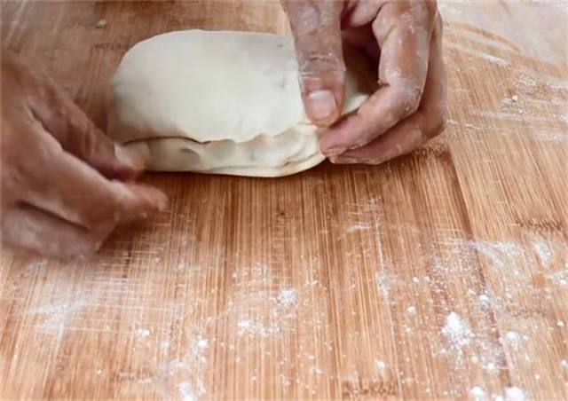 6.然后从一端卷起来,再从左右两边对折下,把周围的小缝隙捏紧,放旁边饧5分钟左右。