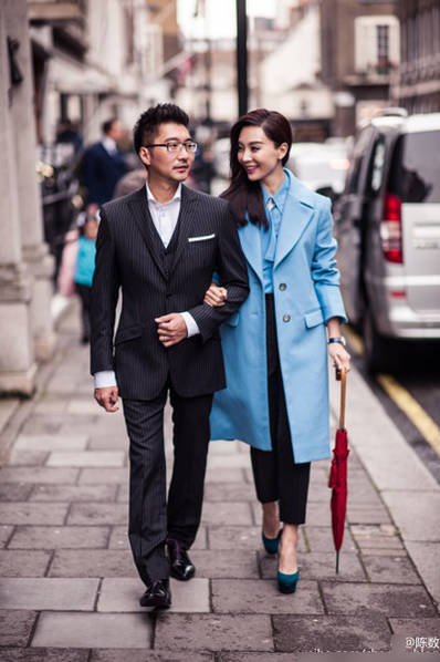 2月20日,陈数微博晒出与老公赵胤胤的时尚大片,并附文:“拄着可爱的小红伞,漫步伦敦的Savile Row(裁缝街)。”照片中,陈数挽着赵胤胤,露出灿烂甜笑,十分甜蜜。 陈数与老公。