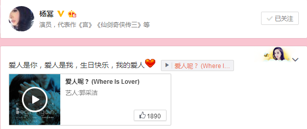 杨幂在微博分享了郭采洁的歌曲《爱人呢?》,并留言道:“爱人是你,爱人是我,生日快乐,我的爱人。” 杨幂微博截图 2月19日晚,杨幂在微博发文“表白”,为爱人送上生日祝福。但是,杨幂口中的“爱人” ...