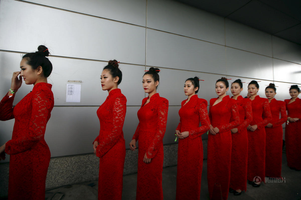 4月17日,上海,2016年F1大奖赛中国站,现场赛车宝贝盘着高高的发髻混搭猩红色旗袍,非常抢眼。