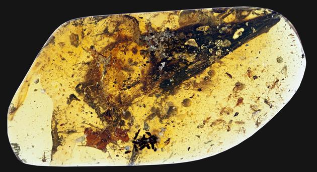天使之翼标本_紫外线下的流纹 天使之翼标本保存较好,包括了桡尺骨、掌骨、指区,以及多种不同形态的羽毛。手指共3根,指式为2-3-1,明显区别于三指型非鸟兽脚类的指骨排列方式(2-3-4)。羽毛包括9根高度 ...
