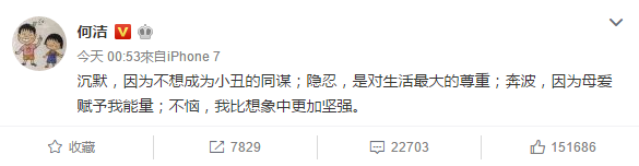 12月20日凌晨,何洁微博发文言辞隐晦引人猜想,微博写到:“沉默,因为不想成为小丑的同谋;隐忍,是对生活最大的尊重;奔波,因为母爱赋予我能量;不恼,我比想象中更加坚强。”随后,何洁经纪人转发此微博并评论称 ...