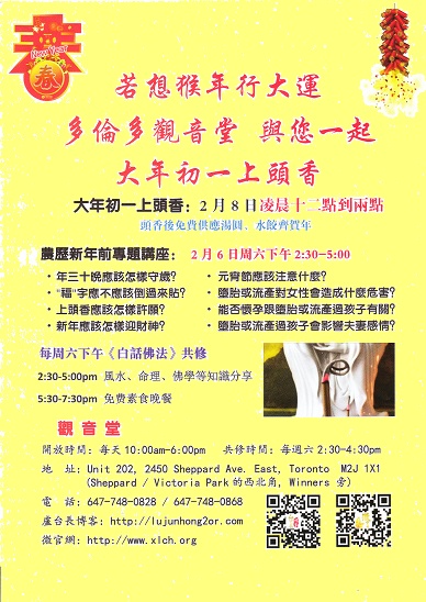 本帖最后由 菩提人生 于 2017-11-16 08:53 编辑 大年初一上头香,多伦多观音堂与您一同金鸡贺新年!