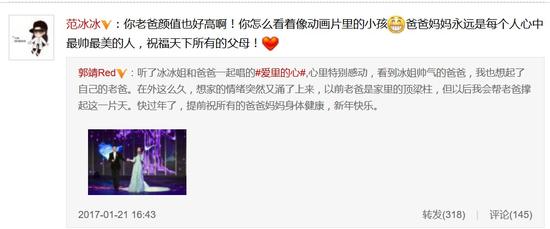 1月21日,范冰冰工作室签约艺人郭靖在微博晒出一组自己与爸爸的旧时合照,称听了范冰冰与范爸合唱《爱里的心》后,想起了自己的老爸。 随后,范冰冰转发评论道,“爸爸妈妈永远是每个人心中最帅最美的人 ...