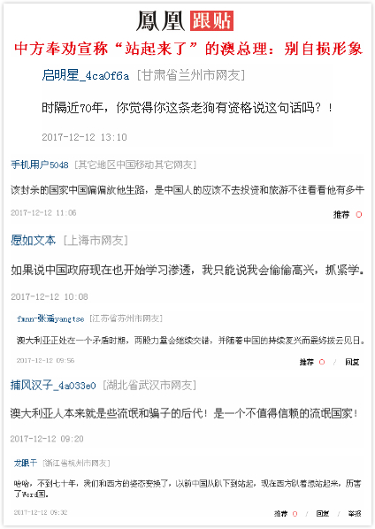 本帖最后由 xlyyj 于 2017-12-12 06:42 编辑 澳大利亚总理特恩布尔日前宣布将推行新的反间谍和外国干预法,又指责称“中国影响力正干预澳大利亚政治”。 特恩布尔还谈到了因涉及接受“中资资助”而辞职的工党联邦 ...