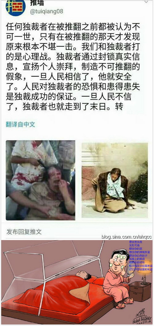 张庆华 提要:维持独裁统治就是两手:一靠恐惧,二靠谎言。当人民不再恐惧,也不相信谎言,那就是独裁统治行将崩溃的临界点,独裁统治的末日就到了。 卡扎菲苦苦挣扎了六个多月,就在不少 ...