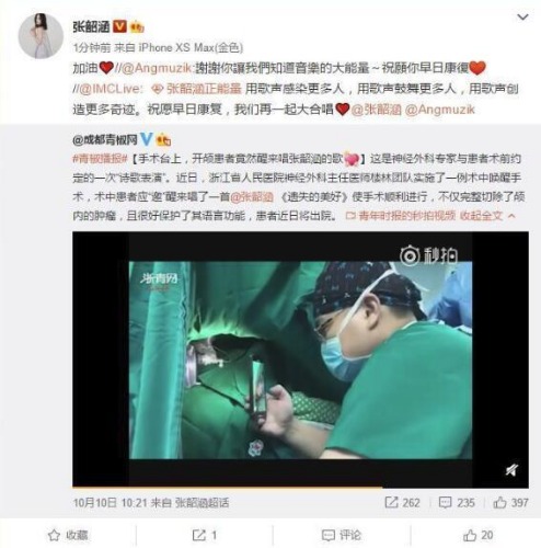 据某媒体爆料,浙江省杭州市的一家医院在进行对患者开颅手术的过程当中,该患者开颅手术中,突然醒来吟唱张韶涵的歌《遗失的美好》,岂不吓人?没事,这是神经外科专家与患者术前约定的一次“诗歌表演”。据悉,这是 ...