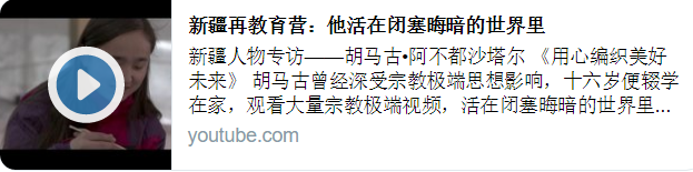 《新疆再教育营:他活在闭塞晦暗的世界里》。新疆人物专访——胡马古•阿不都沙塔尔 《用心编织美好未来》。胡马古曾经深受宗教极端思想影响,十六岁便辍学在家,观看大量宗教极端视频,活在闭塞晦暗的世界里 ...